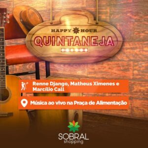 Para fechar o mês das férias em alto estilo, o Sobral Shopping preparou um grande show com talentos da música local para a Quintaneja de hoje, 29 de julho. Matheus Ximenes, Marcílio Call e Renê Django sobem ao palco da praça de alimentação a partir das 19h, cantando os grandes sucessos do sertanejo universitário, e nossas lojas com aquelas delícias que você só encontra no #SeuShopping.