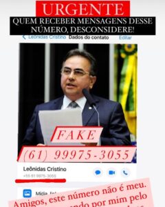 O deputado federal Leônidas Cristino usou suas redes sociais neste sábado, 20 de agosto, para denunciar que bandidos estão usando sua imagem associada a um número de telefone (61-99975.3065) para tentar aplicar golpes pelo whatsapp. O parlamentar pede as pessoas que desconsiderem todas as mensagens enviadas por esse número.