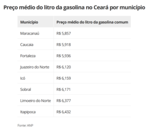 Em relação ao preço médio da gasolina comum por município, a cidade de Maracanaú, na Região Metropolitana de Fortaleza, teve o preço mais barato do Estado, com R$ 5,85.