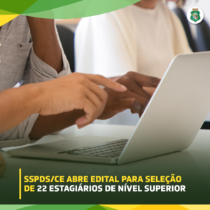 A Secretaria da Segurança Pública e Defesa Social (SSPDS) lança edital para seleção de 22 estagiários de nível superior. As inscrições seguem até o dia 14 de outubro de 2021. Os interessados devem ter matrícula ativa nas instituições de ensino superior, conveniadas com o Governo do Ceará, além de ter cursado, no mínimo, 50% da carga horária do curso.
