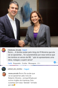 O pronunciamento de Veveu é uma clara posição de que a sobralense Izolda Cela está vivíssima no páreo para suceder Camilo. Competência ela já provou que tem. È do PDT. Vai estar com a caneta. E a postagem pode atender a interesses de alguém que a quer ver fora da corrida governamental.