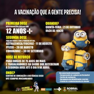 Nesta quinta-feira (21/10), vamos dar continuidade à vacinação da primeira dose para o público acima de 12 anos, segunda dose (confira os prazos) e também dose de reforço para idosos e trabalhadores da saúde.