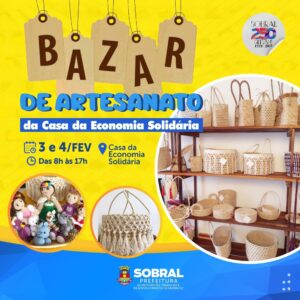 A Casa da Economia Solidária terá um bazar de artesanato, nos dias 3 e 4 de fevereiro, das 8h às 17h. Serão comercializados produtos como sousplats, bolsas, cestos, tapetes, suporte de panela, chapéus, mandalas de palha, trabalhos em crochê e bonecos de amigurumi com até 50% de desconto.