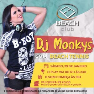 É play de beach tennis e música de qualidade que vocês querem? Então chamamos a top, DJ Monkys, para embalar o sábado, 29 de janeiro, das 19h as 22h.