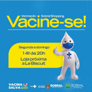 Como forma de contribuir com o município de Sobral na luta para vacinar o mais rápido possível a população contra a Covid-19, o Sobral Shopping abre a partir desta quinta-feira (03/02), um ponto de vacinação permanente em parceria com a Prefeitura de Sobral, através da Secretaria de Saúde. A loja, próximo a loja Le Biscuit, ficará aberta diariamente seguindo o horário do shopping, e irá vacinas crianças a partir de 11 anos e adultos que receberão a dose de reforço.