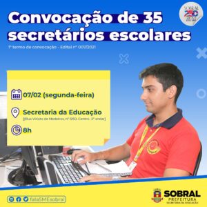 A Secretaria da Educação de Sobral está convocando 35 aprovados na seleção pública para secretários escolares (edital nº 007/2021). A lotação será realizada no dia 7 de fevereiro, a partir das 8h, na sede da Secretaria da Educação (Rua Viriato de Medeiros, nº 1250, Centro- 2º andar), conforme o termo de convocação.