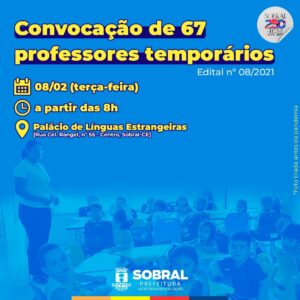 A Secretaria da Educação de Sobral está convocando mais 67 aprovados na seleção pública de professores temporários (Edital nº 008/2021). A lotação será realizada no dia 8 de fevereiro, às 8h, no Palácio de Ciências e Línguas Estrangeiras, localizado à Rua Cel. Rangel, nº 55 , Centro, conforme o dia e horário agendados no termo de convocação.