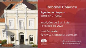 A Santa Casa de Misericórdia de Sobral (SCMS) abriu seleção para Agente de Limpeza. As inscrições devem ser realizadas de 8 a 11 de Fevereiro de 2022, no site www.stacasa.com.br, na aba “Trabalhe Conosco”.