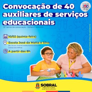 A Secretaria da Educação de Sobral está convocando mais 40 aprovados na seleção pública para o cargo de auxiliar de serviços educacionais (edital nº 03/2021). A lotação será realizada no dia 10 de fevereiro, a partir das 8h, na Escola José da Matta e Silva, localizada na Avenida Doutor José Arimatéia Monte e Silva, 574, no bairro Campo dos Velhos, conforme o termo de convocação.