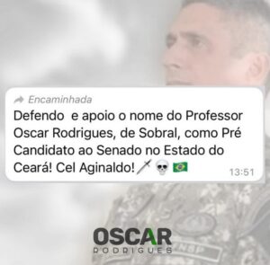 Em recente passagem por Sobral, o comandante da Força Nacional de Segurança, Cel. Aginaldo Oliveira, que deverá ser candidato a deputado federal pelo Ceará, lançou o nome do empresário Oscar Rodrigues para disputa da cadeira de Senador da República, sendo apoiado por alguns mais empolgados.