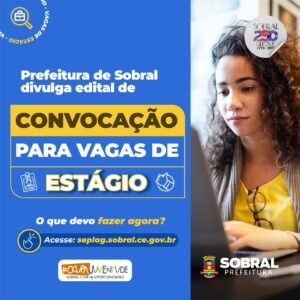 A Prefeitura de Sobral, por meio da Secretaria do Planejamento e Gestão (Seplag), convoca 424 estagiários de nível superior classificados no processo seletivo de n°001/2021, para atuação nas secretarias do município. O edital de convocação (n°03/2022), com todas as informações sobre o processo de contratação, está no Diário Oficial do Município (DOM) n° 1276, desta sexta-feira (25/02).