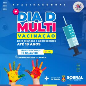 Neste sábado (12/03), a Secretaria da Saúde de Sobral realizará o Dia D de Multivacinação para atualização da carteira de vacinação de crianças e adolescentes até 19 anos, nos Centros de Saúde da Família, da sede e distritos, das 8h às 12h.