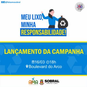A Agência Municipal do Meio Ambiente de Sobral (AMA), por meio das diretorias de Política Ambiental e Parques, Jardins e Unidades de conservação, realiza, nesta quarta-feira (16/03), o lançamento da campanha “Meu lixo, minha responsabilidade”, às 18h, no Boulevard do Arco. A ação tem o intuito de sensibilizar as pessoas sobre o descarte correto do lixo, e debater sobre a Lei Municipal N°1.789, que estabelece as diretrizes da Política Ambiental de Resíduos Sólidos de Sobral.