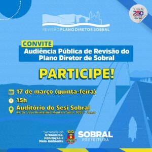 A Prefeitura de Sobral, por meio da Secretaria do Urbanismo, Habitação e Meio Ambiente (Seuma), realiza, nesta quinta-feira (17/03), a 2ª Audiência Pública referente ao processo de Revisão do Plano Diretor de Sobral, no auditório da Federação das Indústrias do Estado do Ceará (Fiec), localizado no Sesi Sobral.