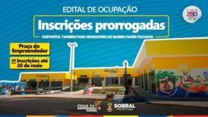 A Prefeitura de Sobral prorrogou, até sexta-feira (20/05), o período de inscrições para o edital de ocupação da Praça do Empreendedor, no bairro Sumaré. Nesta seleção, moradores do bairro Padre Palhano também poderão concorrer a um dos 10 boxes disponíveis, com um termo de permissão de 12 meses. As inscrições podem ser feitas a partir desta terça-feira (17/05) pelo site da Secretaria do Trabalho e Desenvolvimento Econômico (STDE) e, presencialmente, no Centro de Convenções. A divulgação do resultado final está prevista para 27 de maio.
