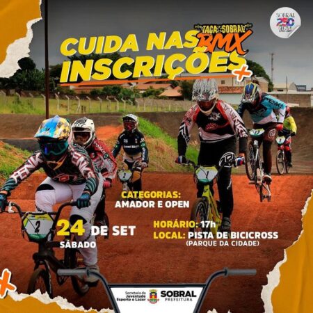 🏆 No próximo sábado, 24 de setembro, a partir das 17h, será realizada a Taça Sobral de BMX 2022, na pista de bicicross do Parque da Cidade, localizada no bairro Expectativa. 🤩 A competição pagará cerca de R$ 7 mil em premiação nas categorias amador e open, na modalidade masculino e feminino.