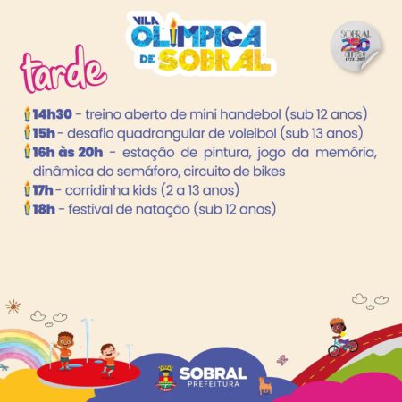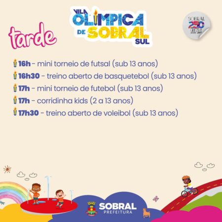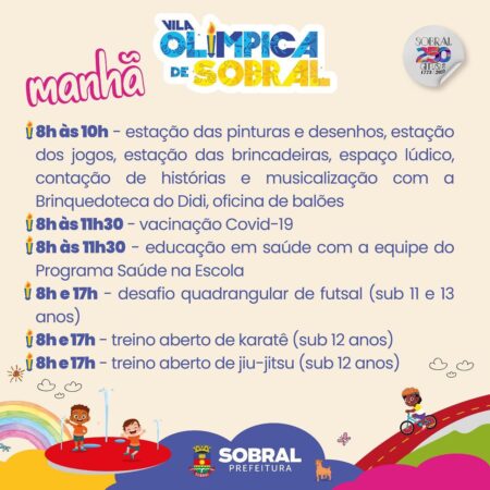 As atividades irão acontecer nesta quarta-feira, dia 12, na Vila Olímpica de Sobral e na Vila Olímpica Sul. Não perde tempo e escolhe para qual você quer ir. Ou faz melhor: vai curtir nas duas! É diversão para toda a família!