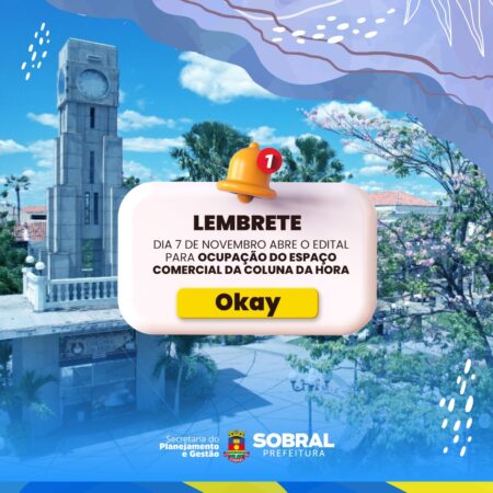 Visando ocupar os espaços públicos com critérios e transparência, a Prefeitura de Sobral, por meio da Secretaria do Planejamento e Gestão (Seplag) e da Central de Licitações (Celic), abrirá dia 7 de novembro o edital de concorrência pública para uso do espaço comercial localizado na Praça da Coluna da Hora. O edital será do tipo maior oferta.