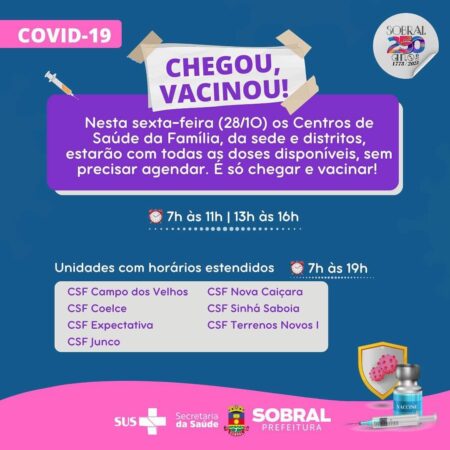 Nesta sexta-feira (28/10) os Centros de Saúde da Família, da sede e distritos, estarão com todas as doses disponíveis da vacina contra a Covid-19, sem precisar agendar. É só chegar e vacinar!