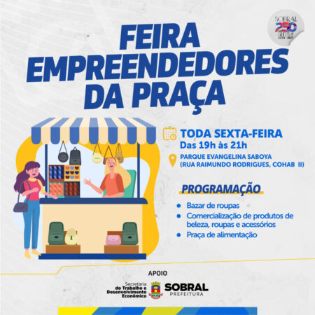 Concludentes do programa Qualifica Mais Progredir do curso de Formação Inicial e Continuada em Microempreendedor Individual (MEI), da Escola Paulo Aragão, realizarão feiras semanais intituladas de “Empreendedores da Praça”, com apoio da Secretária do Trabalho e Desenvolvimento Econômico (STDE). A atividade, que contempla ex-alunos e empreendedores locais, será realizada toda sexta-feira, das 19h às 21h, no Parque Evangelina Saboya, na Rua Raimundo Rodrigues, Cohab II.