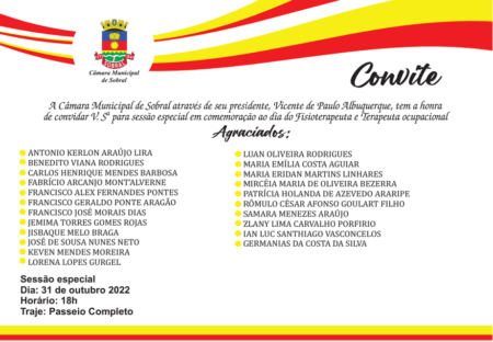 Câmara de Sobral promove HOJE Sessão Especial em comemoração ao Dia do Fisioterapeuta e do Terapeuta Ocupacional