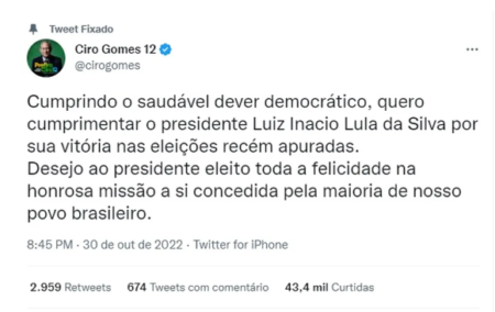 “Cumprindo o saudável dever democrático, quero cumprimentar o presidente Luiz Inácio Lula da Silva por sua vitória nas eleições recém apuradas. Desejo ao presidente eleito toda a felicidade na honrosa missão a si concedida pela maioria de nosso povo brasileiro”, declarou Ciro.
