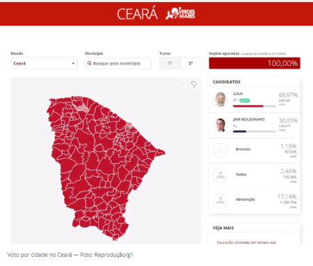 Todos os 184 municípios do Ceará tiveram a maioria dos votos para Luiz Inácio Lula da Silva (PT) no segundo turno das eleições 2022. O Ceará chegou a 100% das urnas apuradas às 20h19 deste domingo (30). Lula teve 69,97% dos votos válidos, contra 30,03% do candidato Jair Bolsonaro (PL), segundo o Tribunal Superior Eleitoral (TSE).