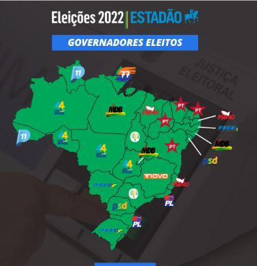 25 homens e 2 mulheres foram eleitos para governar as 27 unidades da federação a partir de 2023. Deslize para o lado e veja quem são eles. Entre os partidos, quem levou mais Estados foram o União Brasil e o PT, com 4 cada um. MDB e PSDB venceram em 3. PSB, PL, PSD, Republicanos e Progressistas terão 2. Novo e Solidariedade ganharam em um Estado.