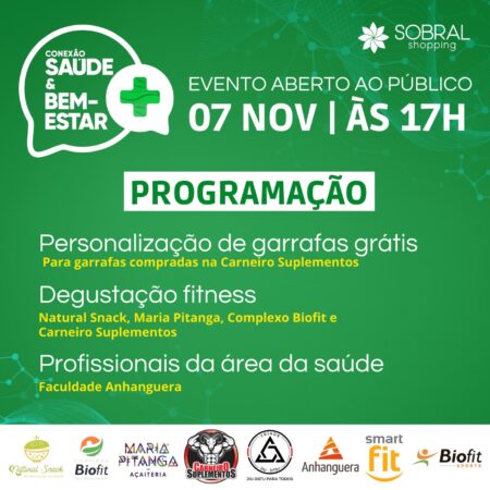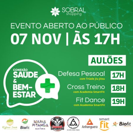 No dia 07 de novembro (segunda-feira), a partir das 17h, o Sobral Shopping realizará a segunda edição do “Conexão Saúde & Bem-Estar”, a ação busca incentivar uma melhor qualidade de vida aos participantes, acontecerá na entrada principal e será aberta ao público.