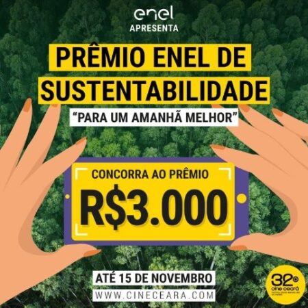 Prorrogadas até o dia 15 de novembro as inscrições para o Prêmio Enel de Sustentabilidade, para a realização de filmes captados em aparelhos celulares e dispositivos móveis. Com o tema “Para um amanhã melhor”, o prêmio é realizado pelo 32° Cine Ceará – Festival Ibero-Americano de Cinema em parceria com a Enel. O objetivo é despertar e incentivar modos inteligentes de usar os recursos naturais gerando baixo impacto ambiental e beneficiando toda a sociedade. A inscrição é gratuita através do site www.cineceara.com.