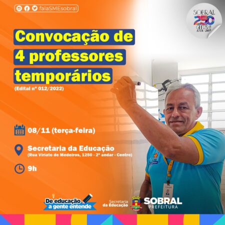A Secretaria da Educação de Sobral (SME) está convocando quatro professores de Atendimento Educacional Especializado (AEE), aprovados na seleção pública de professores temporários (edital nº 12/2022). A lotação será realizada, na terça-feira (08/11), às 9h, na sede da SME, localizada à Rua Viriato de Medeiros, nº 1250, Centro, conforme o termo de convocação.