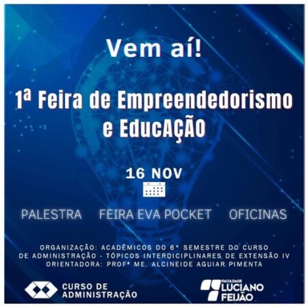 O curso de Administração irá promover a 1º Feira de Empreendedorismo e EducAÇÃO da Faculdade Luciano Feijão. A feira acontecerá no dia 16 de novembro, na FLF, e terá atividades especiais pensadas no atual cenário empreendedor. 😉