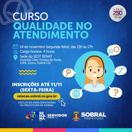 Estão abertas, até 11 de novembro (sexta-feira), as inscrições para o curso de Qualidade no Atendimento, exclusivo para servidores públicos do município. A qualificação, promovida pela Prefeitura de Sobral, por meio das Secretarias do Planejamento e Gestão (Seplag) e do Trabalho e Desenvolvimento Econômico (STDE), em parceria com Serviço Social do Transporte e Serviço Nacional de Aprendizagem do Transporte (SEST/SENAT), é uma das atividades do cronograma de ações da Semana do Servidor Público 2022.