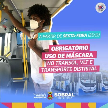 A pandemia ainda não acabou, e pensando na segurança e na saúde de todos, a Prefeitura de Sobral determinou a obrigatoriedade do uso de máscara no TranSol, VLT e Transporte Distrital. A medida passa a valer a partir desta sexta-feira, 25 de novembro. Cuide-se!