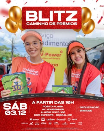 E vamos pra última Blitz de Caminho de Prêmios! 🤩💥 Um sábado com muitos brindes, degustações e diversão no Posto Flash (Sobral), vem aproveitar com a gente! 🙏🏻 A ação acontece no Posto Flash, na Av. Mons. Aluísio Pinto, 100, no bairro Dom Expedito.