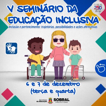 A Secretaria da Educação de Sobral promoverá, nos dias 6 a 7 de dezembro (terça e quarta-feira), na Escola de Saúde Pública Visconde de Saboia, o V Seminário da Educação Inclusiva, que neste ano tem como tema “Inclusão e pertencimento: trajetórias, possibilidades e ações afirmativas”. A programação do evento contará com palestras, oficinas e homenagens a professores, cuidadores, estudantes e familiares.