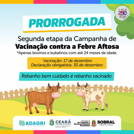 A segunda etapa da Campanha de Vacinação contra a Febre Aftosa no Ceará, voltada para bovinos e bubalinos com até 24 meses de idade, foi prorrogada até 30 de dezembro. No novo prazo estabelecido, a Secretaria do Trabalho e Desenvolvimento Econômico (STDE) continuará disponibilizando atendimento presencial para que os produtores possam emitir a declaração obrigatória de vacinação de seus animais, de segunda a sexta-feira, das 8h às 12h e das 13h às 17h.