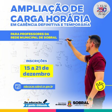 A Prefeitura de Sobral divulgou dois editais para a suplementação de carga horária (ampliação temporária), em carência definitiva (edital nº 25/2022) e temporária (edital nº 26/2022), de professores para as escolas públicas municipais de Sobral. As inscrições para os dois processos seletivos serão realizadas, exclusivamente, pela internet, de 15 a 21 de dezembro, no site https://selecao.sobral.ce.gov.br
