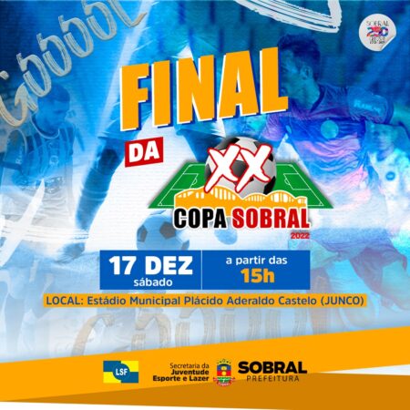 A final da XX Copa Sobral de Futebol será realizada, no sábado (17/12), a partir das 15h, no Estádio Municipal Plácido Aderaldo Castelo, localizado no bairro Junco. O evento é uma realização da Liga Sobralense de Futebol, com apoio da Prefeitura de Sobral, por meio da Secretaria da Juventude, Esporte e Lazer (Secjel).