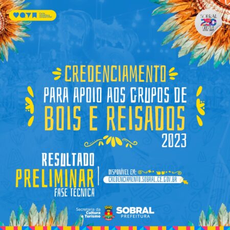 A Prefeitura de Sobral, por meio da Secretaria da Cultura e Turismo (Secult), divulgou o resultado preliminar da fase de avaliação técnica do Edital de apoio aos grupos de Bois e Reisados. O resultado fica disponível no Diário Oficial do Município (DOM nº 1473) e no Sistema de Credenciamento de Sobral (https://bit.ly/3j9gOaf).