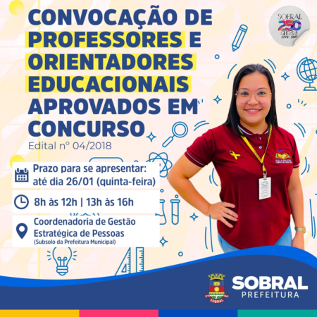 A Prefeitura de Sobral está convocando 19 aprovados no concurso público para professor e orientador educacional (psicólogo) da rede pública municipal de ensino de Sobral (Edital nº 04/2018). Esta é a quarta chamada de orientadores e a sexta chamada de professores aprovados neste edital.