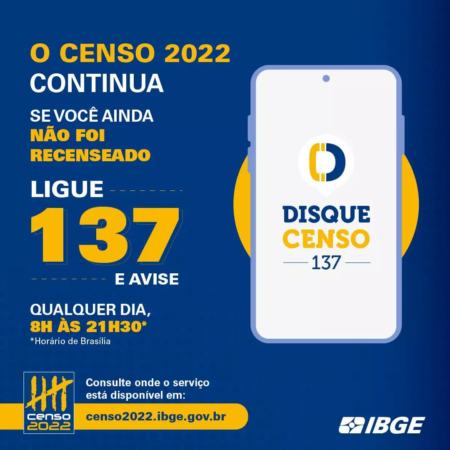 A coleta do Censo 2022 está em campo desde agosto. Os recenseadores do IBGE estão visitando todos os domicílios brasileiros. Caso você não tenha respondido ao questionário, verifique se alguém no seu domicílio respondeu. Se ninguém respondeu, ligue para 137 e fale conosco. A ligação é gratuita, todos os dias, de 8h até 21h30