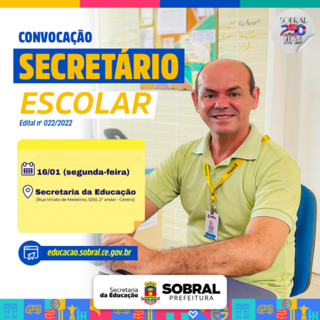 A Secretaria da Educação de Sobral está convocando aprovados na seleção pública para secretários escolares (edital nº 022/2022). A lotação está sendo realizada nesta segunda-feira (16/01), na Secretaria da Educação, localizada na Rua Viriato de Medeiros, 1250, 2º andar – Centro.