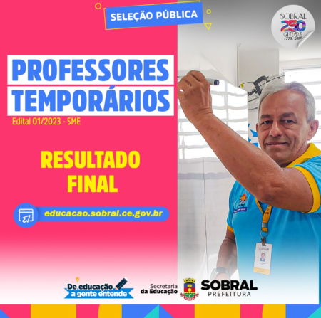 A Secretaria da Educação de Sobral divulgou, nesta terça-feira (24/01), o resultado final da seleção pública para composição de banco de professores temporários (edital nº 01/2023).