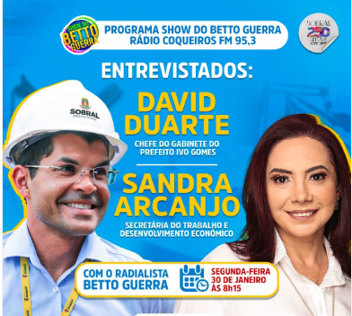 Nesta segunda (30/1), o chefe de gabinete do prefeito Ivo Gomes, David Duarte, e a secretária do Trabalho e Desenvolvimento Econômico, Sandra Arcanjo, estarão no programa Show do Betto Guerra, na rádio Coqueiros FM, para um bate-papo sobre as intervenções no Mercado Central e outros assuntos referentes a economia sobralense, a partir das 8h15.
