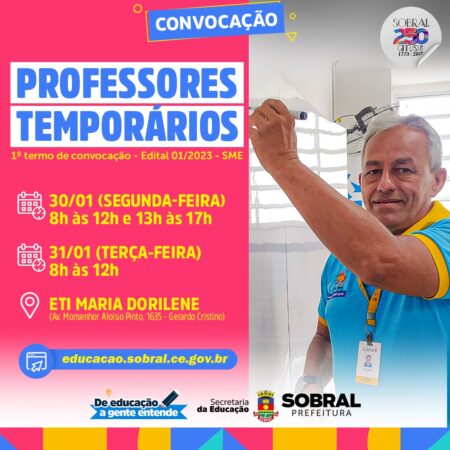 A Secretaria da Educação de Sobral está convocando novos aprovados na seleção pública de professores temporários (edital nº 01/2023). A lotação será realizada nos dias 30 e 31 de janeiro (segunda e terça-feira), na Escola de Tempo Integral Maria Dorilene Arruda Aragão, localizada na Avenida Monsenhor Aloísio Pinto, 1635 – Gerardo Cristino de Menezes.