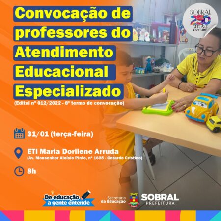 A Secretaria da Educação de Sobral está convocando novos professores de Atendimento Educacional Especializado (AEE), aprovados na seleção pública de professores temporários (edital nº 12/2022). A lotação será realizada na terça-feira (31/01), a partir das 8h, na Escola de Tempo Integral Maria Dorilene Arruda Aragão, localizada na Avenida Monsenhor Aloísio Pinto, 1635 – Gerardo Cristino de Menezes.
