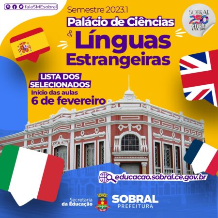 A Secretaria da Educação de Sobral divulgou, nesta segunda-feira (30/01), a lista dos estudantes selecionados para os cursos de Inglês, Espanhol, Francês, Italiano e Informática, ofertados pelo Palácio de Ciências e Línguas Estrangeiras para as turmas de 2023.1.