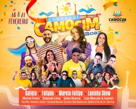 Confira todas as atrações que irão animar o melhor Carnaval 2023 do litoral do Ceará!!! A Prefeitura de Camocim confirmou as presenças de Felipão, Galicia, Márcia Felipe, Laninha Show, Luís Marcelo & Gabriel, Michel Firmo, Deborah Lima, Selva Branca e muitos outros artistas locais e regionais.