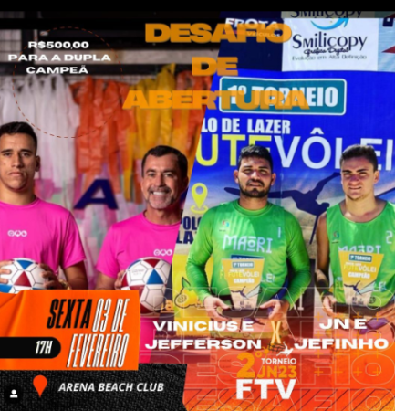 As competições começam a partir das 17h desta sexta-feira ((3/2) e se estende por todo o final de semana, com jogos eletrizantes, muita resenha, música e amizade. Já na abertura do Torneio, um super desafio entre os atletas Vinicius/Jefferson contra João Neto/Jefinho promete esquentar a galera, com prêmio de R$ 500,00 para a dupla vencedora.